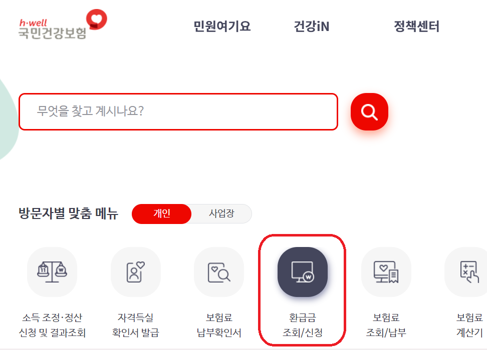2. 방문자별 맞춤 메뉴에서 환급급 조회/신청을 클릭합니다.