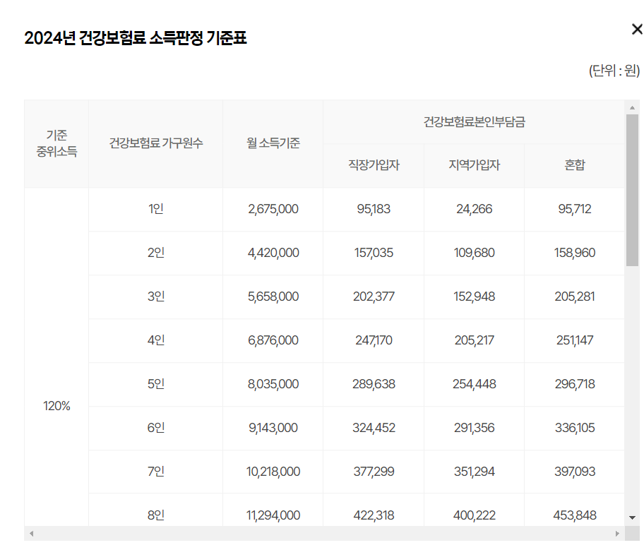 - 소득요건 : 2024년 2월 건강보험료 기준 2024년 소득기준표