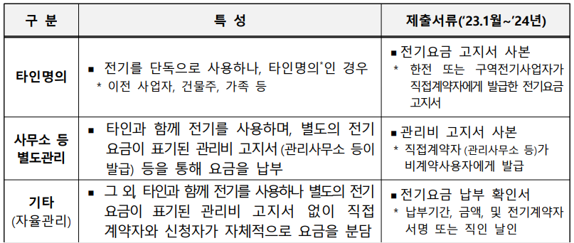 - 직접계약자: 대상자 통지 이후 최초로 발행되는 전기요금고지서부터 전기요금 차감이 적용